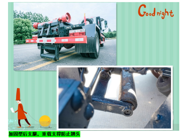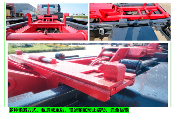 ◇上装配置:强度合金钢一体式主勾臂,加强型副梁,铸钢尾托轮,手自一体室内外液压操控,上装提升能力3000KG, 液压完成上箱+下箱+锁紧+自卸等作业,实现一车配多箱的循环转运。可采用加强型上装,伸缩臂,油缸加粗,加装液压支腿,搭配建筑垃圾箱使用,提升能力7000Kg。